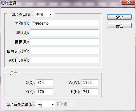 切片選項 -- 劃取完分區(qū)以后,要對切片進行一些設(shè)定是很重要的,切片工具下Alt+點擊切片,會彈出如下窗口