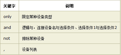 從上面的例子可以看出,字符間以空格相連,選取條件包含在小括號內(nèi),srules為兼容設(shè)置的樣式表,包含在中括號里面。only(限定某種設(shè)備,可省略),and(邏輯與),not(排除某種設(shè)備)為邏輯關(guān)鍵字,多種設(shè)備用逗號分隔,這一點繼承了css基本語法。