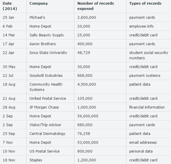 根據電子郵件收發和網絡安全解決方案的領先供應商AppRiver,以下是美國2014年的某些主要的安全漏洞: