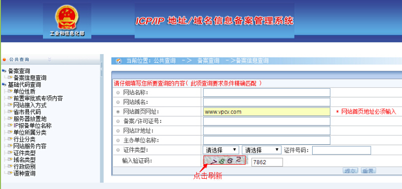 選中“網(wǎng)站首頁網(wǎng)址”方式后,提示“ * 網(wǎng)站首頁地址必須輸入”,我們輸入要查詢的網(wǎng)站地址首頁,例如輸入http://www.baidu.com,再輸入驗證碼,點擊頁面底部的“提交”按鈕即可進行查詢。